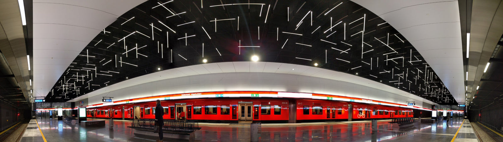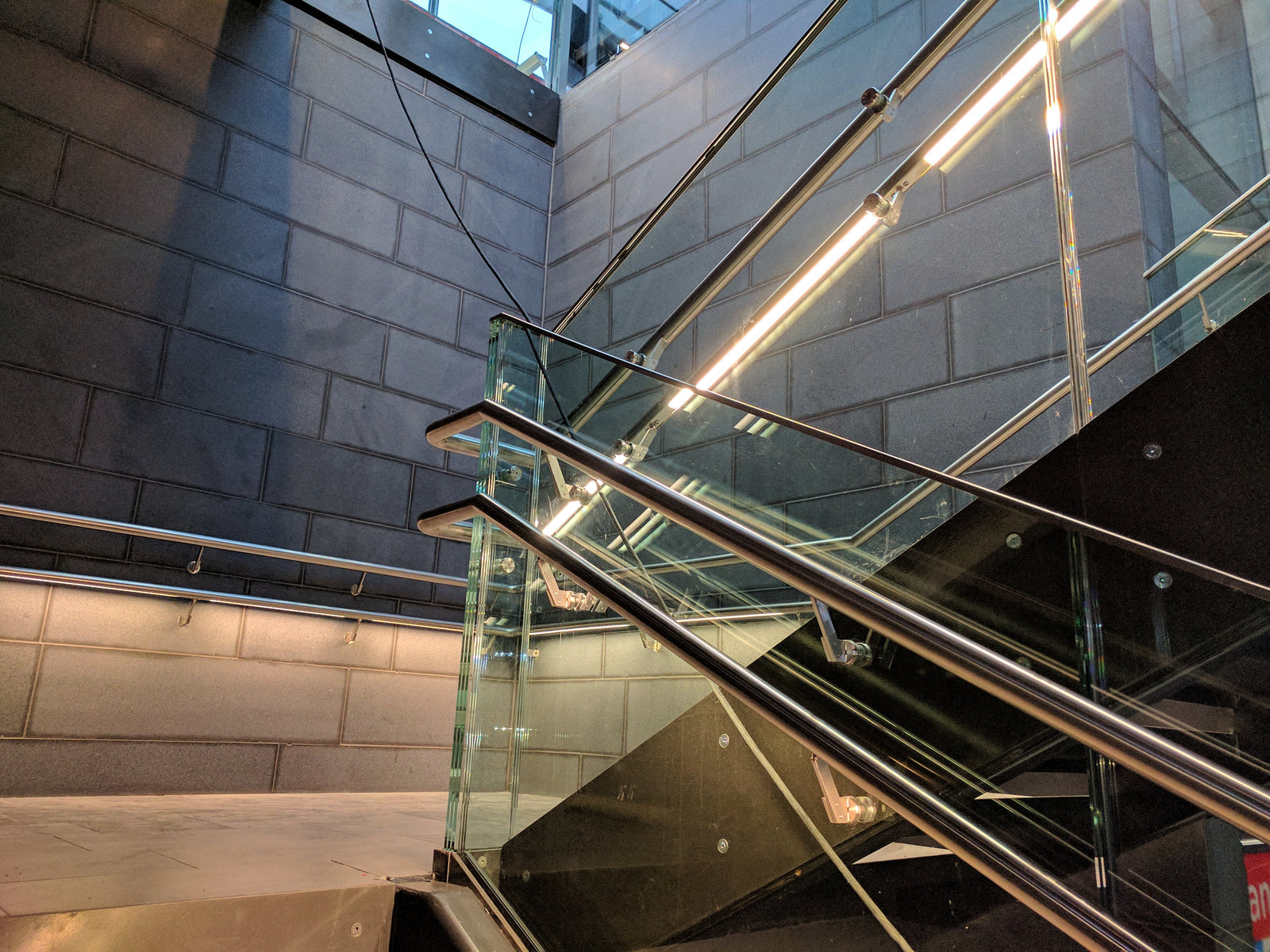 Laiturihallin portaikkojen valaistut käsijohteet. Misal RAIL